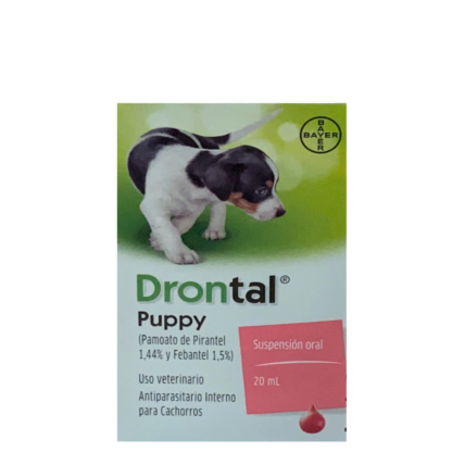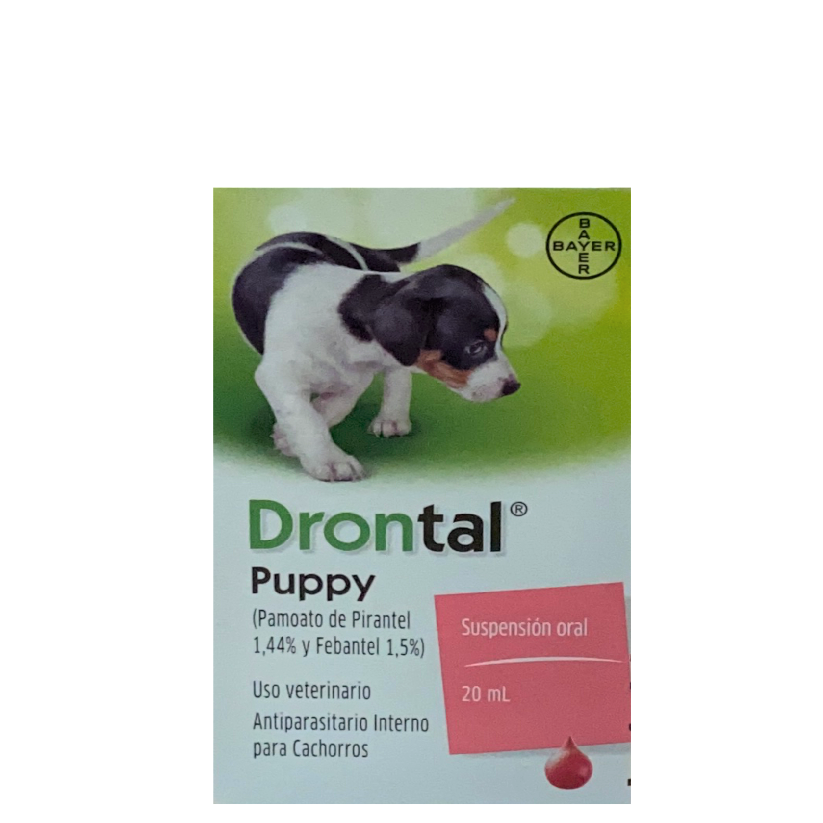 Cada ml de Drontal puppy contiene: Pamoato de Pirantel Febantel Drontal puppy esta indicado en el tratamiento contra parásitos intestinales de los cachorros y perros jóvenes de todas las razas caninas, tanto de hembras como de machos.