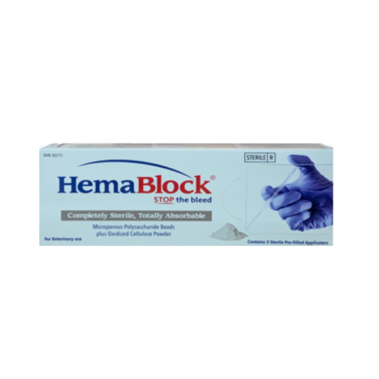 Hemablock hemostático es un producto probado y totalmente natural diseñado para controlar el sangrado durante procedimientos quirúrgicos, aplicaciones dentales y lesiones tópicas/trauma. Hemablock es 100% a base de plantas, proporcionando una alternativa más segura a los agentes hemostáticos basados en proteínas químicas o animales. Diseñado para controlar el sangrado profuso y difuso, Hemablock trabaja en minutos para controlar el sangrado y se descompone enzimáticamente en cuestión de días sin complicaciones. El polvo hemostático de HemaBlock es una mezcla cinéticamente cargada que utiliza la tecnología única Microporosa Polysaccharide Bead (MPB) combinada con fibras micronizadas de celulosa oxidada reabsorbible, que complementa la seguridad y eficacia de la tecnología MPB activa. Las microperlas esterilizadas actúan como un tamiz molecular para deshidratar rápidamente la sangre, acelerando así el proceso natural de coagulación. El coágulo se descompone enzimáticamente dentro del cuerpo en cuestión de días para asegurar que no hay problemas adversos con la curación del paciente, haciendo HemaBlock el polvo de coagulación de sangre más seguro y eficaz disponible. Es un producto simple y seguro que se puede dejar dentro del cuerpo para controlar el sangrado problemático.