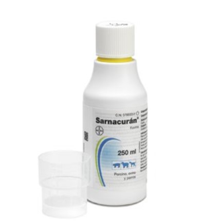 Tratamiento por inmersión: Especialmente indicado para ovinos. Sarna, 1,5 L para 1.000 L. de agua, como carga inicial. Carga de reposición, 2 L. Melófago ovino (falsa garrapata). 0,75 L para 1.000 L de agua. Carga de reposición, 1 L. Para lograr un mejor emulsión es conveniente premezclar la cantidad de Sarnacuran® requerida para el baño en 10 – 20 L. de agua. Añadir a continuación al baño y agitar enérgicamente. Reponer según las dosis indicadas cada vez que se haya extraído un 10 a 20% del líquido del baño. Sumergir a los animales durante 1/2 minuto. En caso de sarna se recomienda repetir el tratamiento a los 7 días. Tratar todo el rebaño, eliminar las costras y fumigar los establos y utensilios para evitar reinfestación. El ingrediente activo es desdoblado biológicamente en el baño a los 4 – 5 días, pudiendo ser eliminado el contenido del baño sin causar trastornos en el medio ambiente. Por ello hay que llenar nuevamente el baño para repetir el tratamiento.